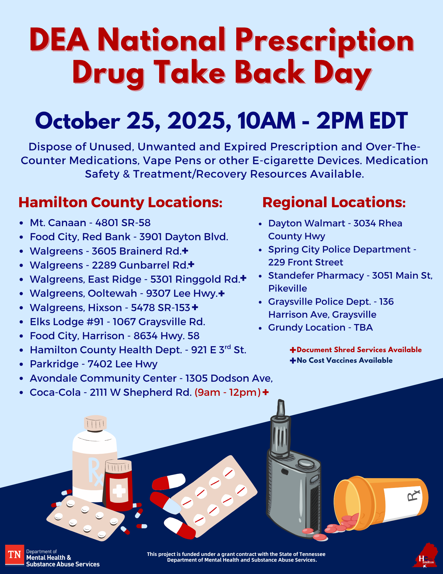 Join The Hamilton County Coalition and Local Law Enforcement and Partners in the DEA Drug Take Back on Saturday, October 25, 2025, from 10:00 a.m. to 2:00 p.m. at Multiple sites across Hamilton County and the Region. See and download the flyer.